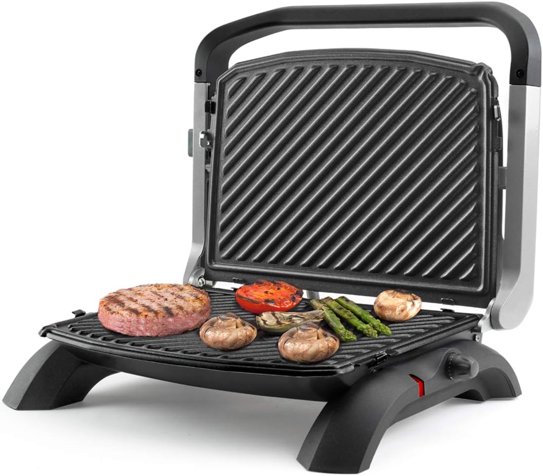 Más allá de su fácil limpieza, es un grill muy capaz. Sus 1800W de potencia y el termostato regulable te aseguran un control preciso del calor. Además, su apertura de 180º te permite duplicar la superficie de cocción, transformándolo en una práctica plancha de asar de gran tamaño (dos placas de 31.5 x 24 cm).